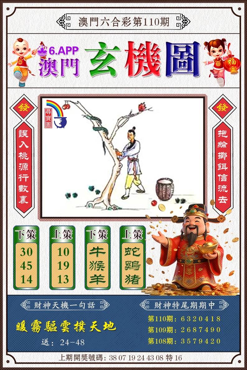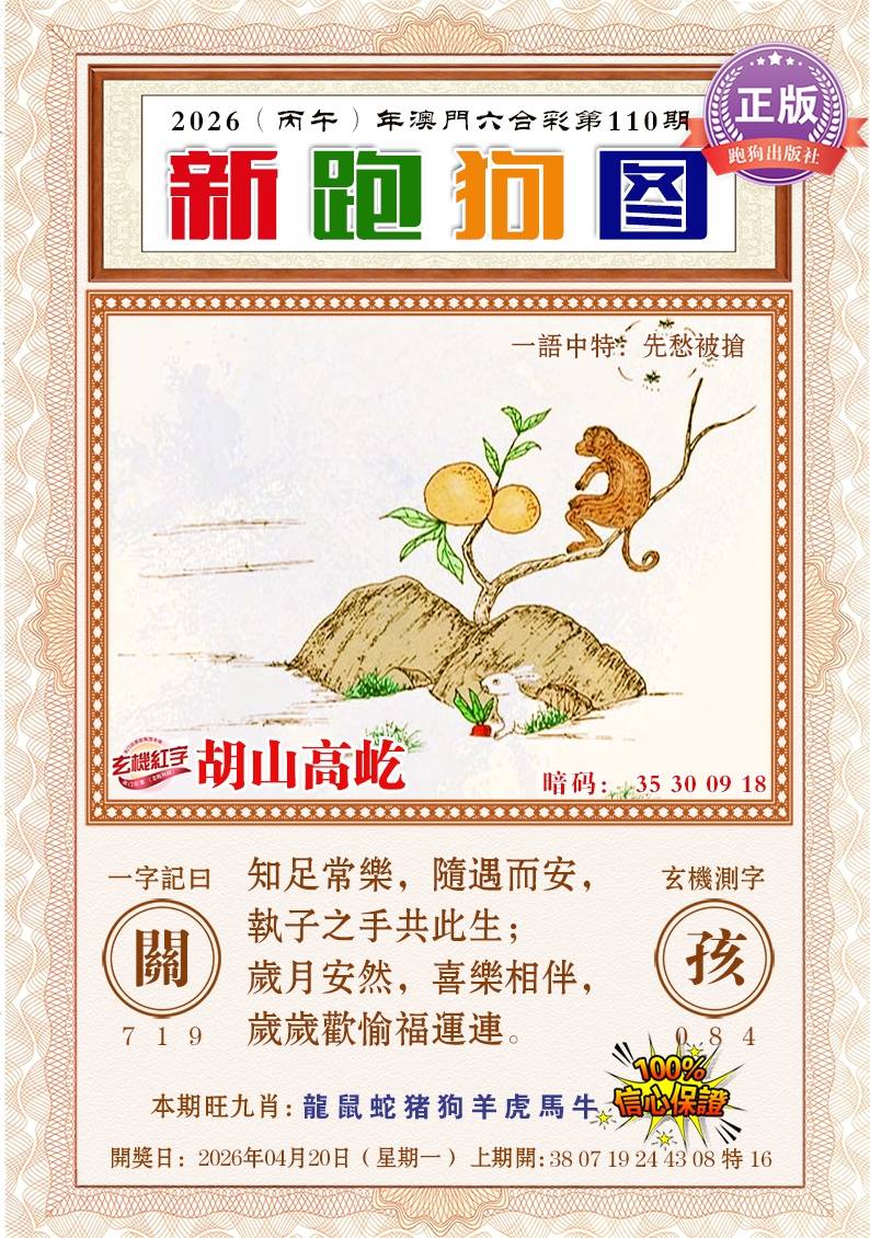 109期:【跑狗解析】开?00 新版跑狗:誘之以利,動之以情,湘君祠对空山,得物無用,凡事看清,料得故园今夜梦 一句中特:横赋暴敛 解析:图中是男子在检地上的红色果子,解男肖鼠牛虎龙猴狗马,解红波 本期六肖:兔马猴虎猪鸡 12肖:04.16.01.13.11.23.05.17.08.20.10.22 |